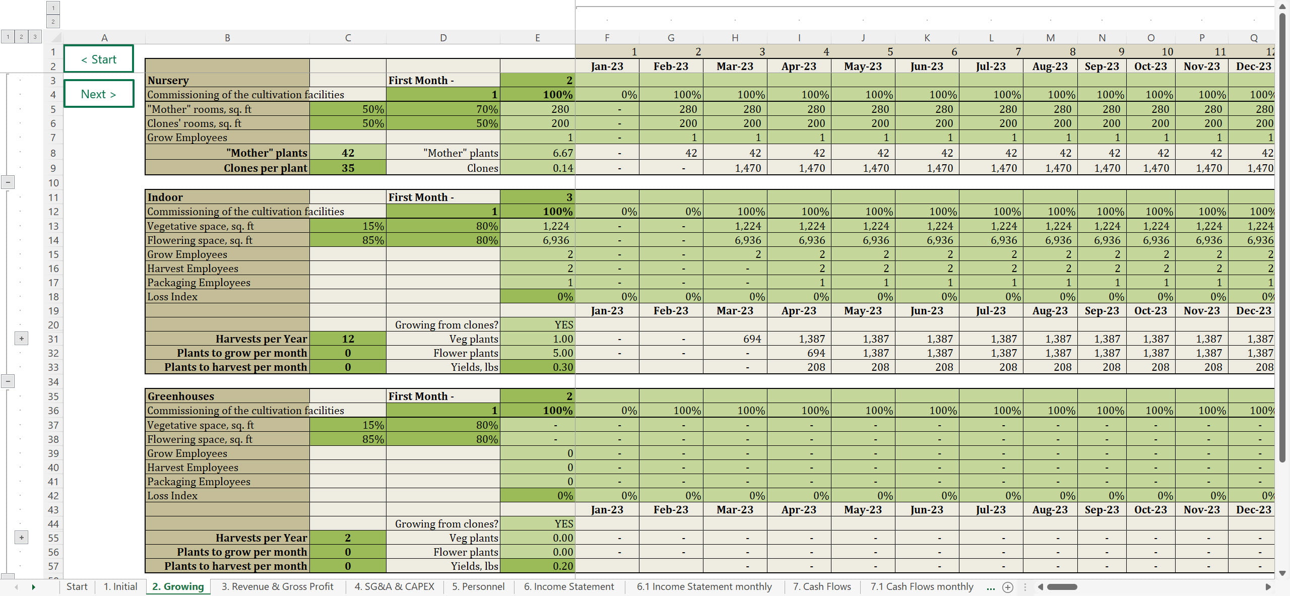 To plan your growing schedule for each room individually, use our “grow room calculator” spreadsheet that we offer for all templates with cultivation. You can then use the results to calculate grow room costs and profits with our pre-populated cannabis cultivation financial model.
