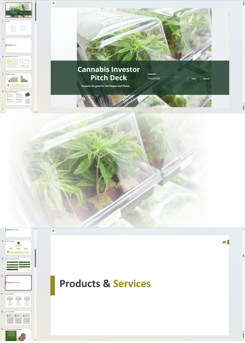 This template works for a cannabis cultivation and nursery business. The Cannabis Cultivation and Nursery Investor Pitch Deck Template consists of 37 PowerPoint slides. Our pitch deck templates include a variety of slides – you can pick and choose the ones that work best for your story, creating a personalized and distinctive presentation.