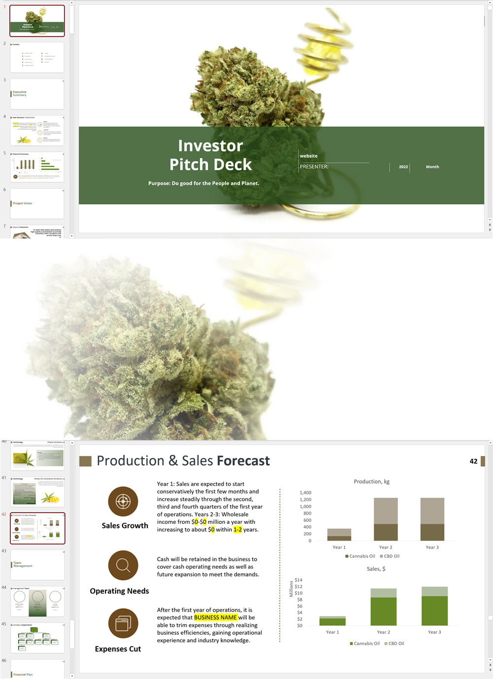 Decks should be as concise as possible, you should give your 10-15 slides in twenty minutes, to ensure your audience remains attentive and engaged. Rather than reading off the slides, use the deck for supporting visual content, such as graphs, charts and key buzzwords, and develop a verbal pitch that supports the visuals. Pictures and graphs are more powerful than words here. Usually, a more human interaction works better. You introduce yourself, you talk about why you decided to start a cannabis and hemp business, and you continue digging into the details in a conversational way. We offer a wide variety of slides so you can choose the ones that best suit your business and create the perfect presentation.